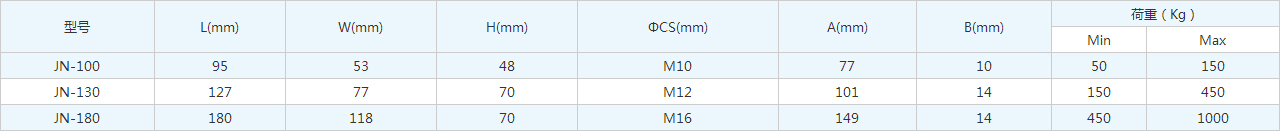 | 型號 | L(mm) | W(mm) | H(mm) | ΦCS(mm) | A(mm) | B(mm) | 荷重(Kg) | |