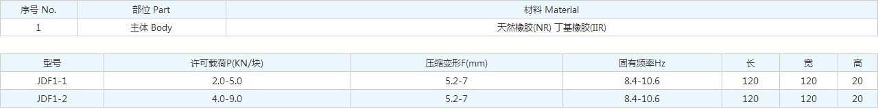 | 型號 | 許可載荷P(KN/塊) | 壓縮變形F(mm) | 固有頻率Hz | 長 | 寬 | 高 |