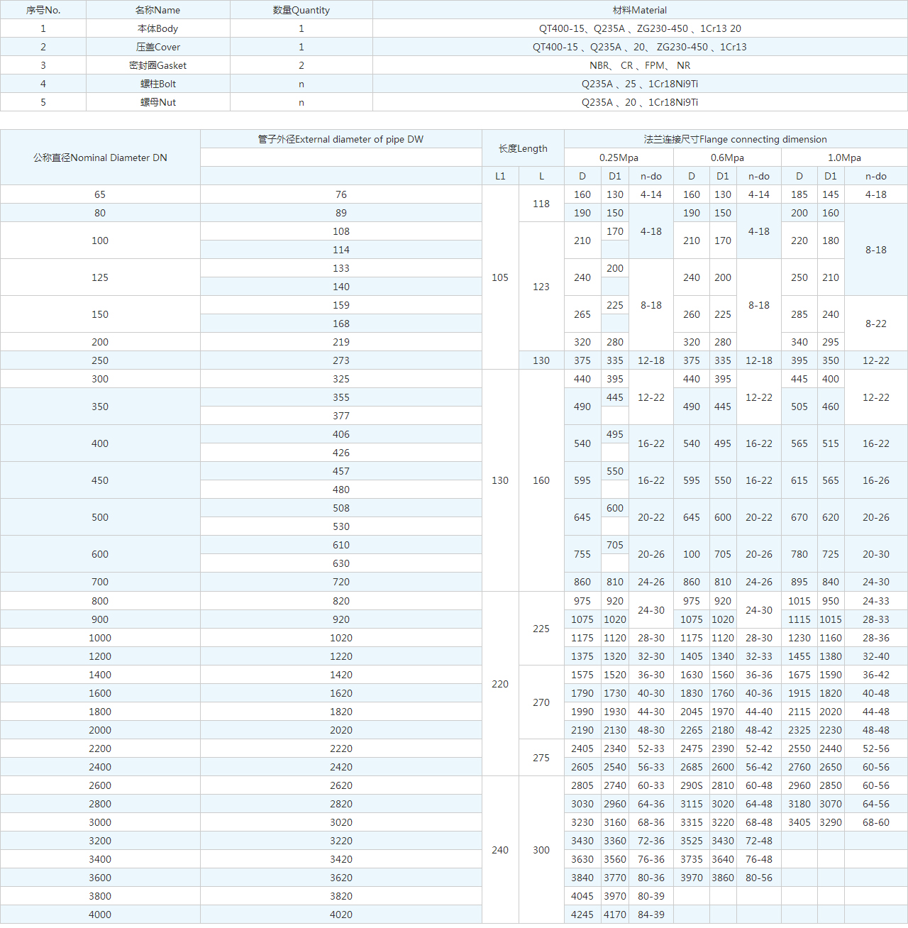 | 公稱直徑Nominal Diameter DN | 管子外徑External diameter of pipe DW | 長(zhǎng)度Length | 法蘭連接尺寸Flange connecting dimension | |||||||||